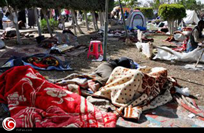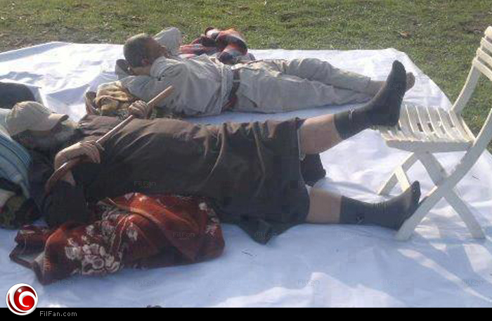رجل يفترش الأرض ممددا قدمه في الخلاء أثناء الاعتصام