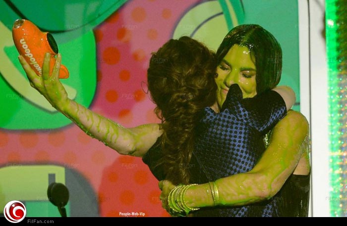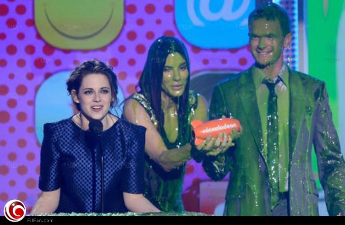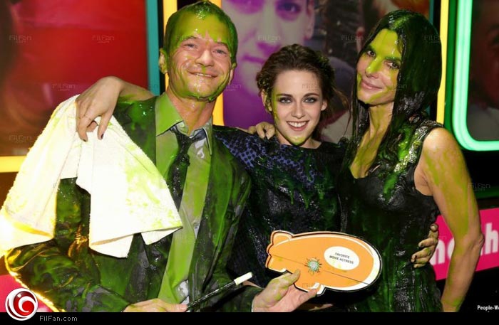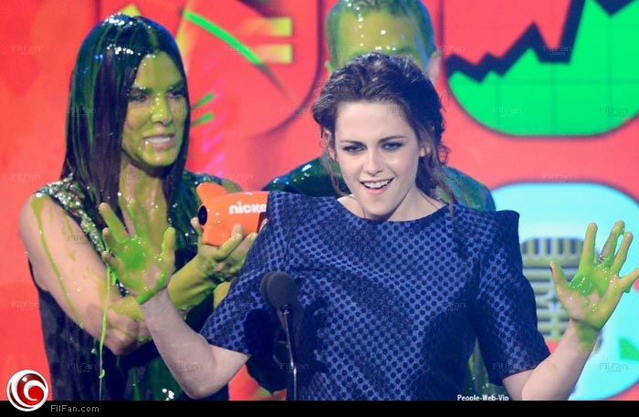كريستين ستيوارت تحرص على حضن ساندرا بوليك رغم اتساخ فستانها بالسائل الأخضر اللزج الذي تشتهر به قناة "Nickelodeon"