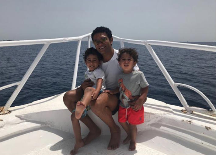 نشر الممثل آسر ياسين صورته مع ابنيه من رحلة بحرية قاموا بها.