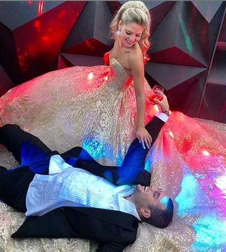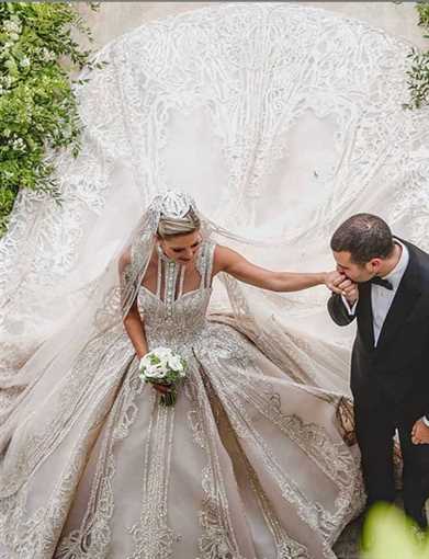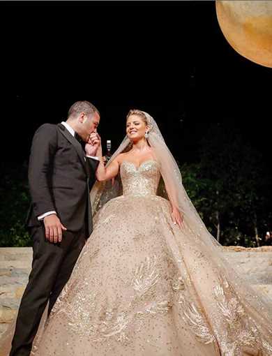 وحرص أغلب حاضرات الحفل على ارتداء فساتين من تصميم صعب نفسه، وكذلك العروس التي ارتدت فستانين من تصميمه.