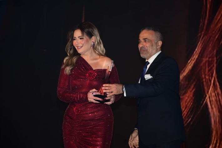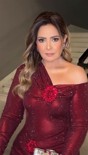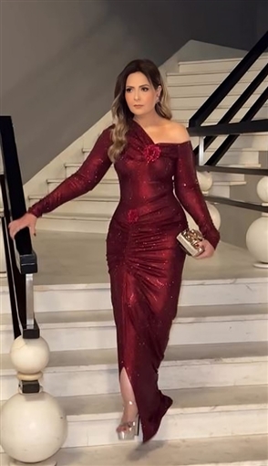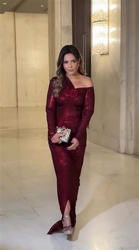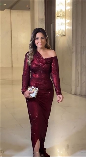 ولفتت صابرين الأنظار برشاقتها خلال الحفل وارتدت فستانا لامعا باللون الأحمر الغامق.