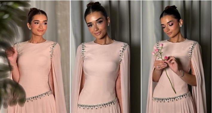 واختارت ملك أحمد زاهر فستانا باللون الوردي بأكمام طويلة مفتوحة من الشيفون، بنفس اللون وزينت منطق الزيك بكريستالات براقة وعند الأكمام من تصميم Taya Couture.