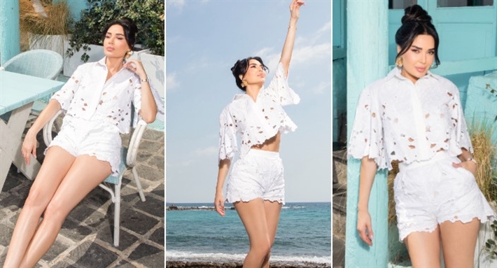اختارت سيرين عبد النور إطلالة باللون الأبيض، من قطعتين الأولى قمي ص أبيض قصير وواسع كشف عن بطنها، مع شورت أبيض قصير.