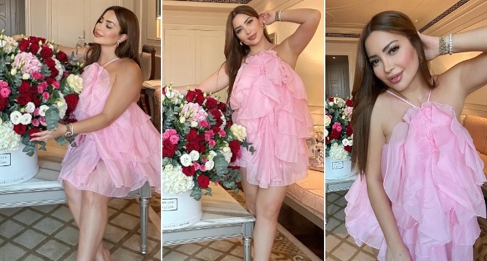 ارتدت نسرين طافش فستانا قصيرا من الشيفون باللون الوردي جعلها تبدو كالوردة.