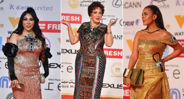 اختارت كل من لبلبة وهاجر الشرنوبي وغادة ابراهيم ارتداء فساتين واكسسوارات بطابع فرعوني.