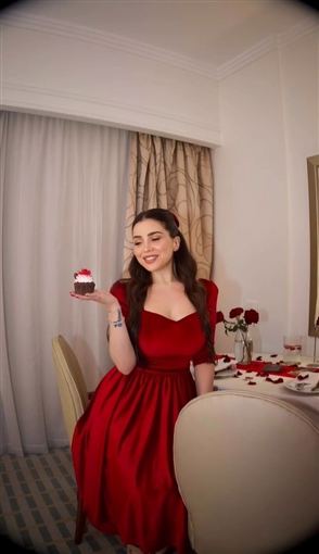 أطلت مي عز الدين بفستان متوسط الطول باللون الأحمر من خامة القطيفة وتركت شعرها ينسدل مموجا على كتفها وزينه بفيونكة باللون الأحمر.