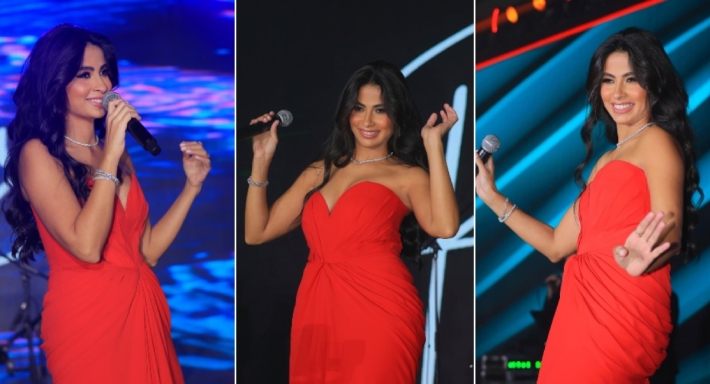 بوسي تخطف الأنظار بجامبسوت أحمر في حفلها الغنائي ليلة رأس السنة