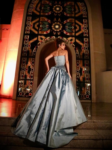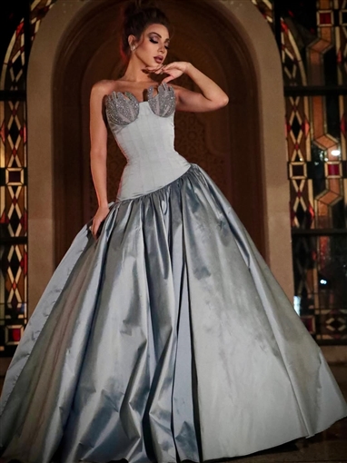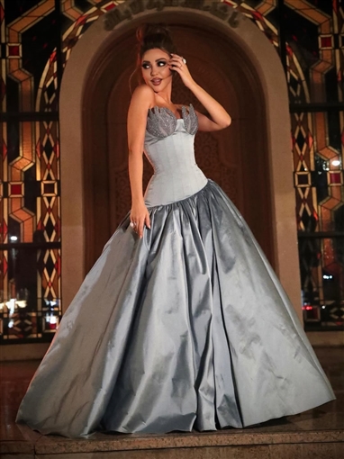 واختارت ميريام فارس فستانا فضيا مكشوف الكتفين أبرز رشاقتها، ولملمت شعرها إلى أعلى.