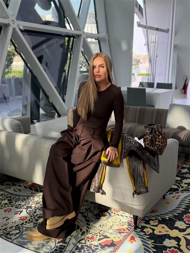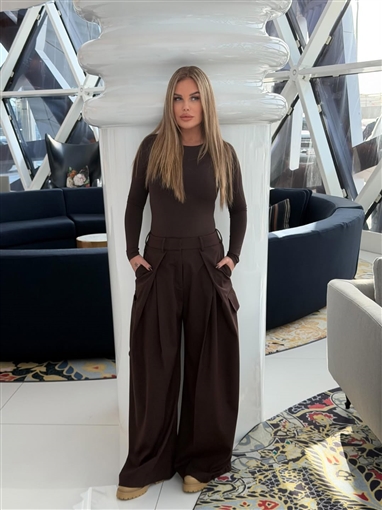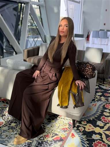 وأطلت نيكول سابا في جلسة التصوير بمجموعة أنيقة وعصرية باللون البني، مكونة من بلوزة ضيقة بأكمام طويلة، مع بنطلون واسع الساقين بخصر مرتفع بكسرات أمامية بارزة.
