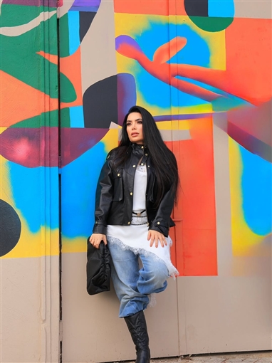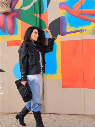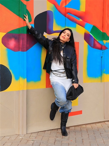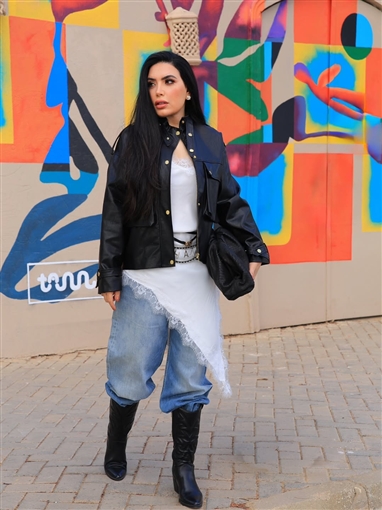 أطلت عبير صبري في الصور بإطلالة كاجوال مع بنطلون جينز أزرق وتوب أبيض طويل من جانب واحد وجاكيت جلد أسود.