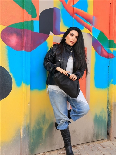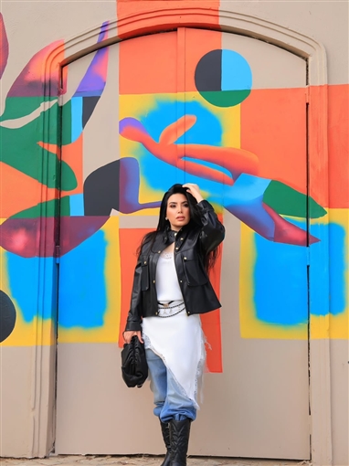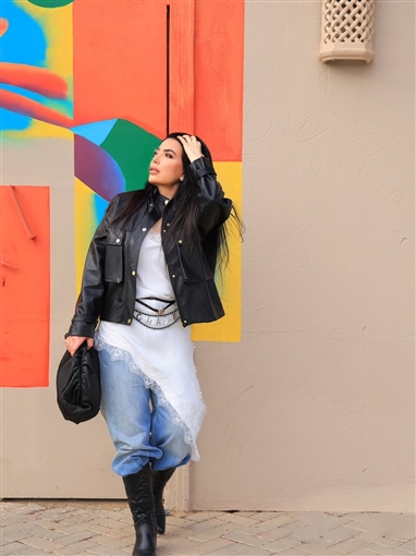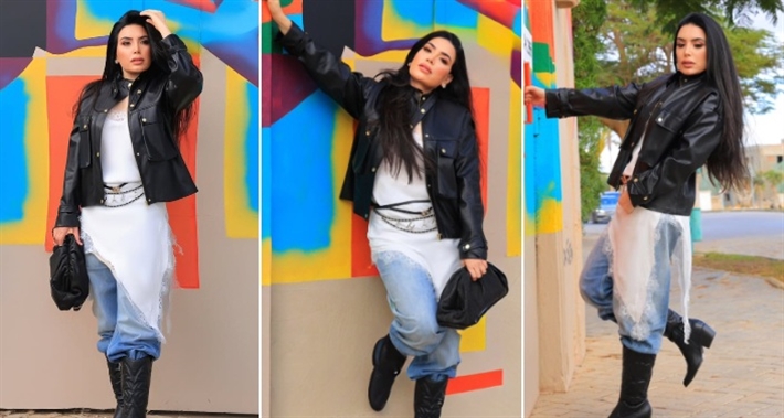أطلت عبير صبري في الصور بإطلالة كاجوال مع بنطلون جينز أزرق وتوب أبيض طويل من جانب واحد وجاكيت جلد أسود