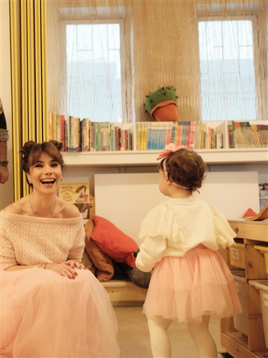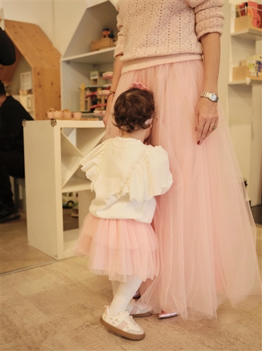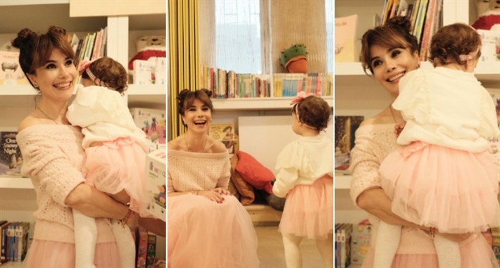 ارتدت سونجول أودان وابنتها ملابس متشابهة مع بلوفر أبيض وتنورة وردية من التل.