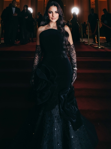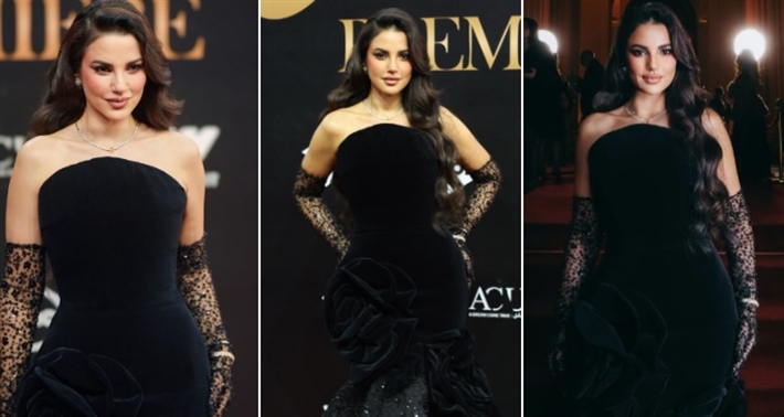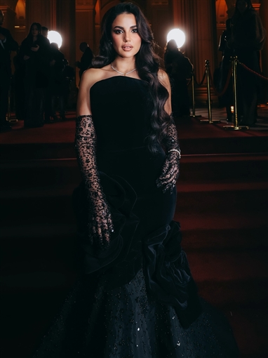 مع قفاز أسود شفاف، والفستان من تصميم أنطوان قارح لمجموعته VELVET MYSTERY couture 2024.