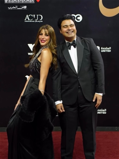 وكان فستان ريم مصطفى طويل وضيق بفتحة عند منطقة البطن، مطرز من منطقة الصدر يظهر رشاقتها.