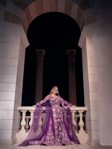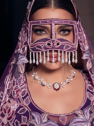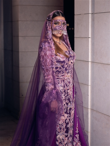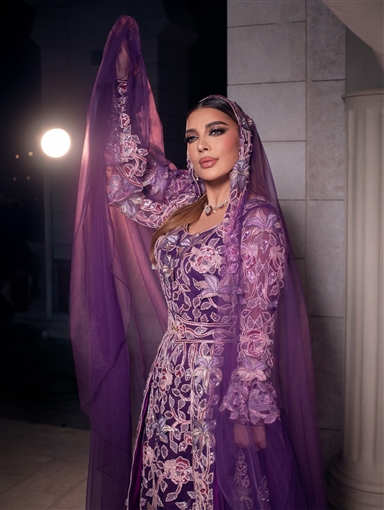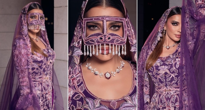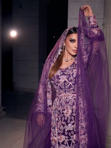 وأطلت أصالة بفستان بنفسجي مطرز بالكامل مع طرحة من الشيفون من نفس اللون وبرقع.
