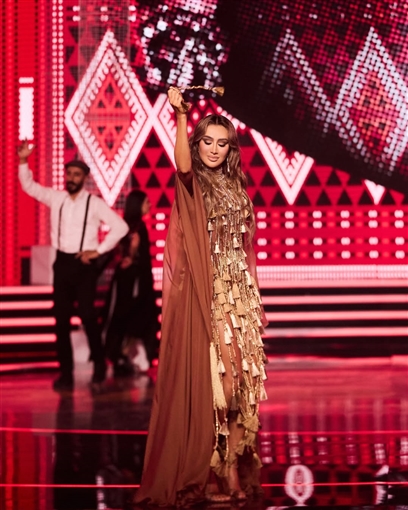 وتميزت الإطلالة الثانية لمايا دياب بفستان ذهبي قصير مزين بسلاسل ذهبية مع وشاح شفاف رافقها لحظة دخولها على المسرح.