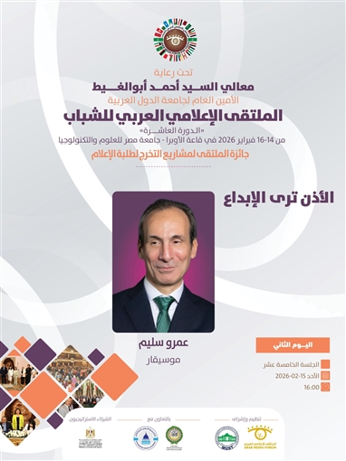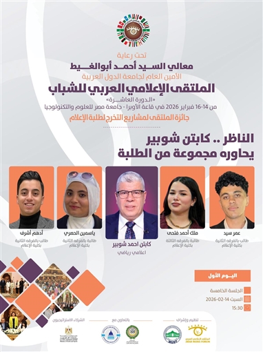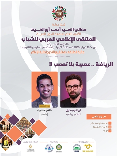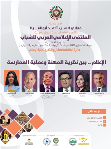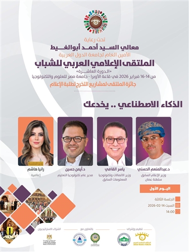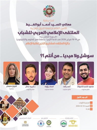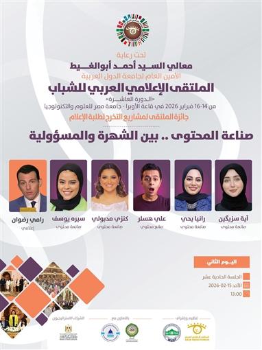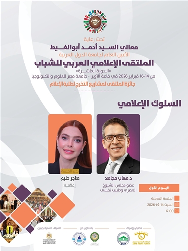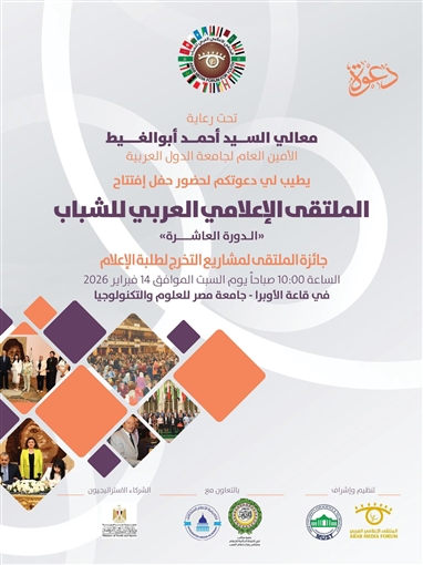 الملتقى الإعلامي العربي للشباب في دورته العاشرة الذي ينظمه الملتقى الإعلامي العربي بالتعاون مع جامعة مصر للعلوم والتكنولوجيا، برعاية السيد أحمد أبوالغيط الأمين العام لجامعة الدول العربية ، في الفترة من 14 وحتى 16 فبراير 2026.