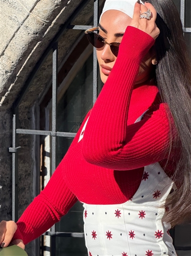 ارتدت بلوفر أحمر مع "جمبسوت" أبيض بنقشات حمراء وجاكيت أبيض بنفس النقشات