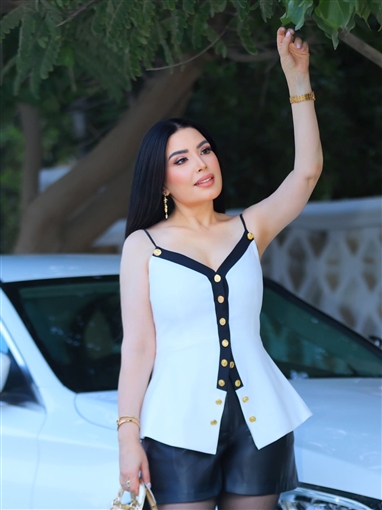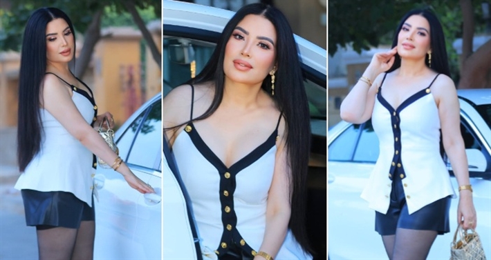 ظهرت عبير صبري ترتدي توب أبيض "حمالات" مع أزرار ذهبية، وشوت أسود من الجلد، مع جورب أسود طويل وشفاف وحذاء برقبة عالية