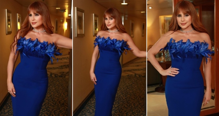 اختارت كارول سماحة فستانا باللون الأزرق الملكي من الخامة "الكريب" طويل وضيق أظهر رشاقتها