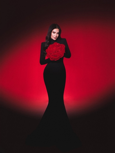الفنانة سيرين عبد النور ظهرت بفستان أسود بالكامل حتى القفازات، وأمسكت بوردة حمراء كبيرة تارة عند الوسط وتارة وضعتها على شعرها.