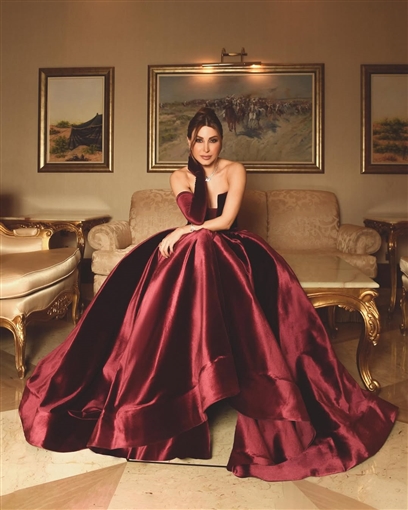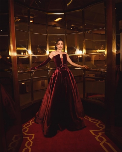 أما الفنانة نسرين طافش فاحتفلت بعيد الحب وعيد ميلادها وظهرت في جلسة تصوير بفستان أحمر طويل وضيق من خامة القطيفة مع شكل فيونكة من منطقة الصدر وأسفل الظهر، وحزام حدد خصرها.