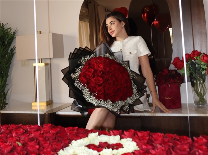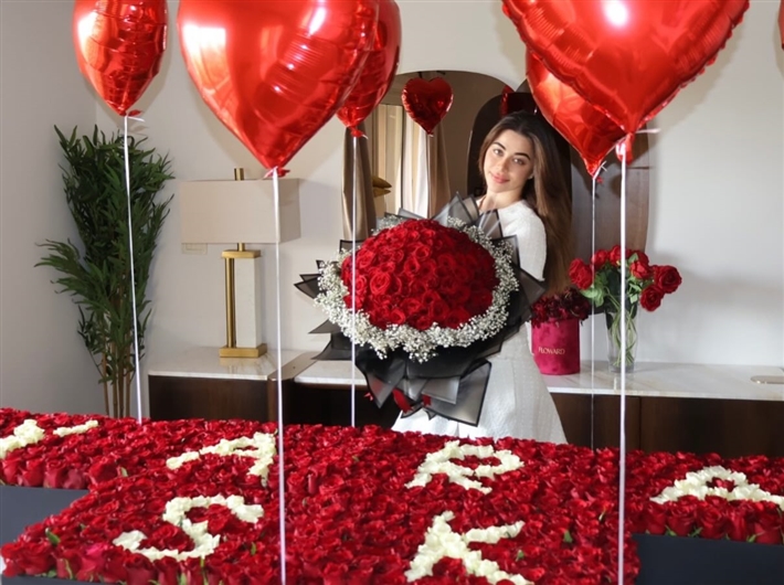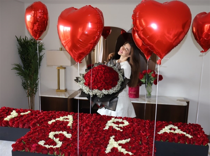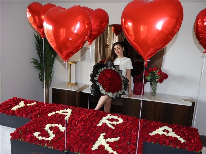 كما تزين المكان بورود حمراء وبيضاء تكتب اسمها، فضلا عن بالونات على شكل قلب.