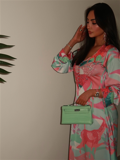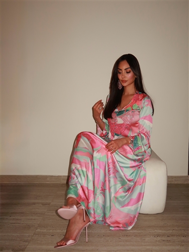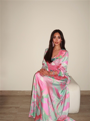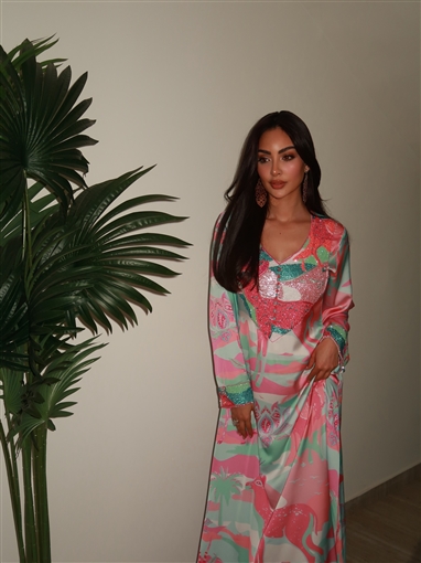 وكان طويلا بأكمام طويلة وألوان زاهية، يدمج الألوان الوردي والأخضر، برسومات على شكل غزالة، ومطرز من منطقة الصدر