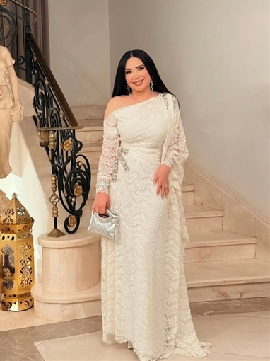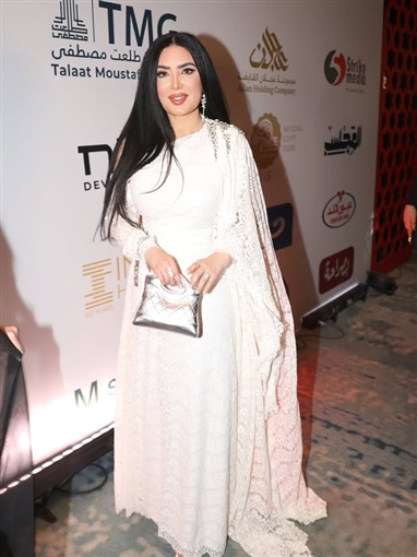 واختارت عبير صبري إطلالة بيضاء مع قفطان أبيض مكشوف الكتف الأيمن، وهو من تصميم أحمد عبد الله لمجموعة رمضان 2026