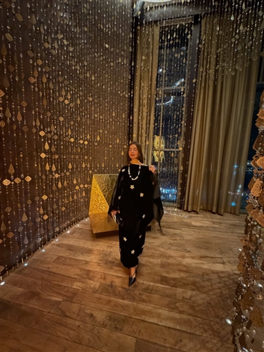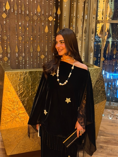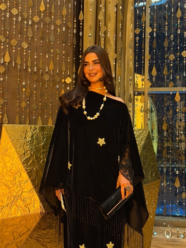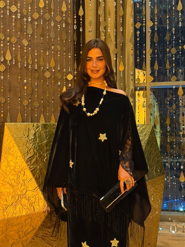 والإطلالة مطرزة بشكل نجوم ذهبية.