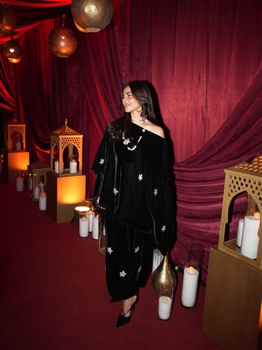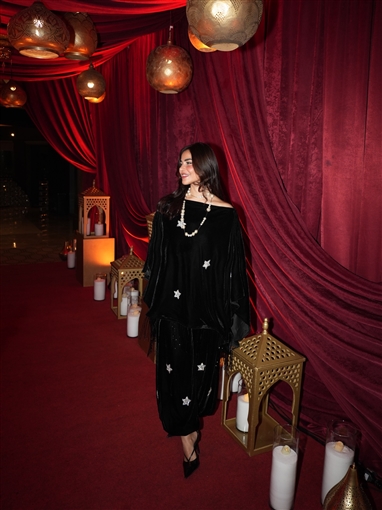 واختارت رانيا منصور إطلالة باللون الأسود وابتعدت عن القفطان أو الفساتين وأطلت بكيمونو أسود وبنطلون أسود واسع من خامة المخملي.
