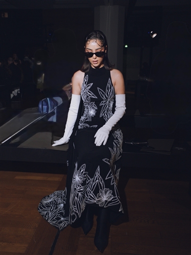 وكان فستانا باللون الأسود من خامة "الكريب" مطرز بخيوط فضية على شكل زهور وورق شجر، مع "cape" متصل من الأكتاف.