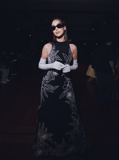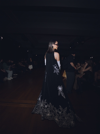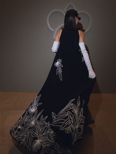 وكان فستانا باللون الأسود من خامة "الكريب" مطرز بخيوط فضية على شكل زهور وورق شجر، مع "cape" متصل من الأكتاف