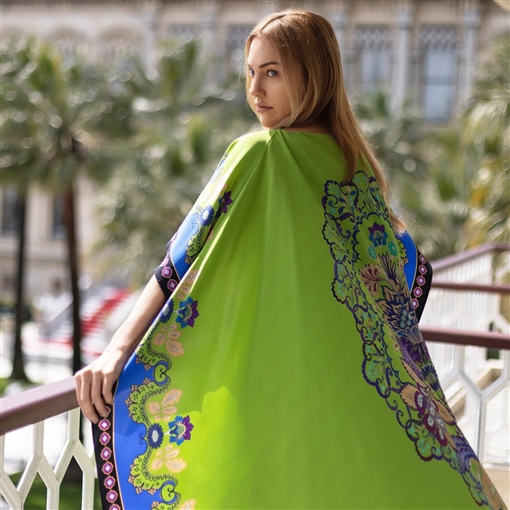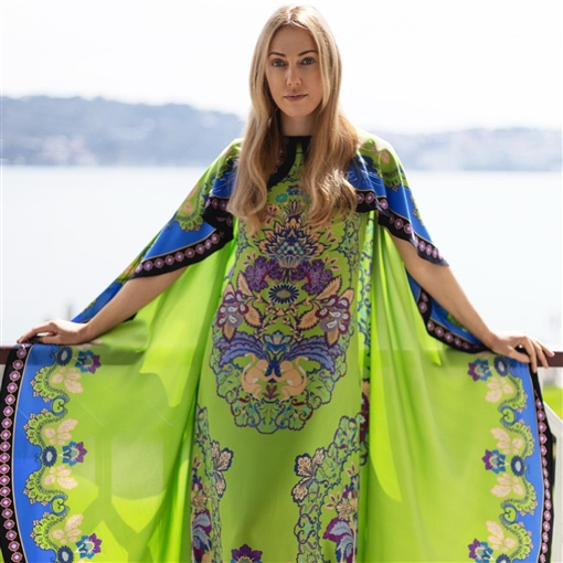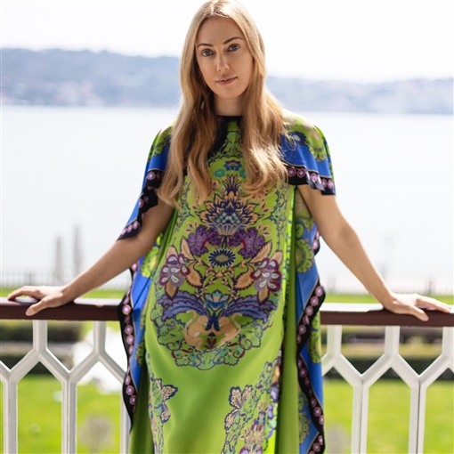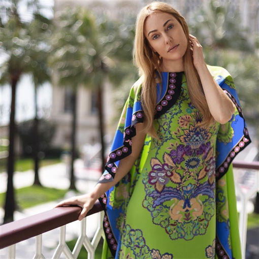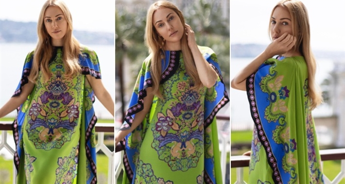 ويدمج فستان مريم أوزلي ألوان الأخضر والأزرق مع رسومات ورود بألوان البرتقالي والبنفسجي.
