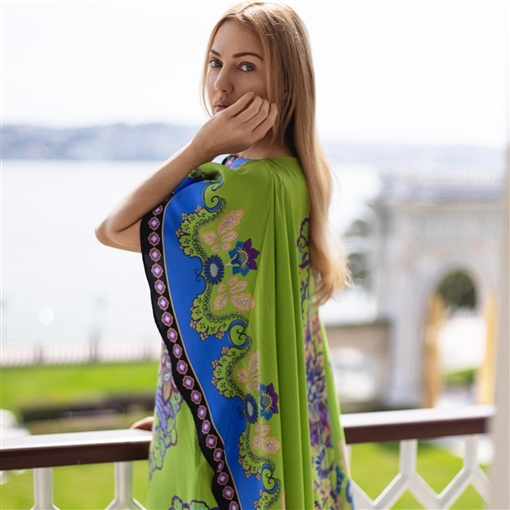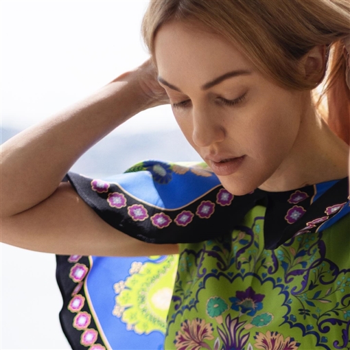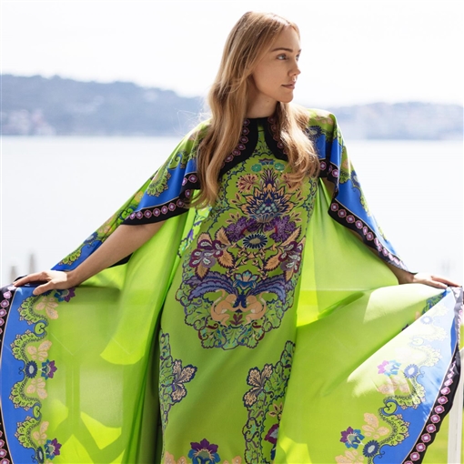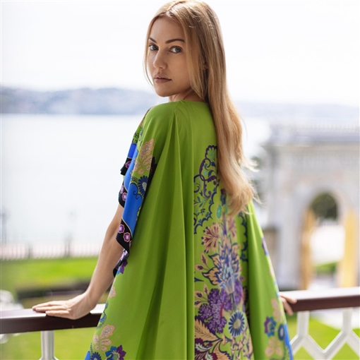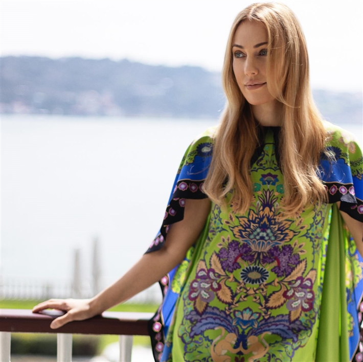 ويدمج فستان مريم أوزلي ألوان الأخضر والأزرق مع رسومات ورود بألوان البرتقالي والبنفسجي