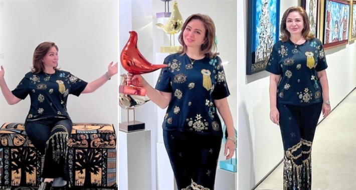 وارتدت إلهام شاهين تي شيرت وبنطلون أسود، من Camilla ومجموعتها "التمائم"