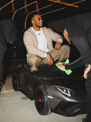 محمد رمضان يلتقط صورة وخلفه سيارات لامبورجيني وفيراري