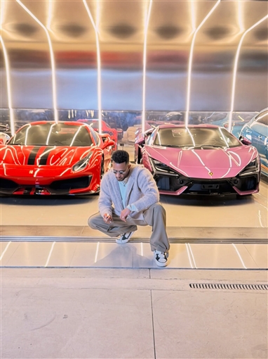 وظهر يلتقط صورة وخلفه سيارات لامبورجيني وفيراري.