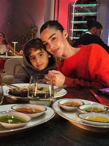 بسمة بوسيل وشقيقها وابنها مع الأصدقاء في الجونة