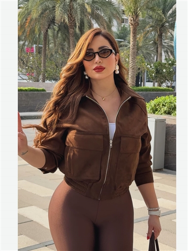 ارتدت نسرين طافش جاكيت قصير وواسع باللون البني مع بنطلون ضيق من نفس اللون