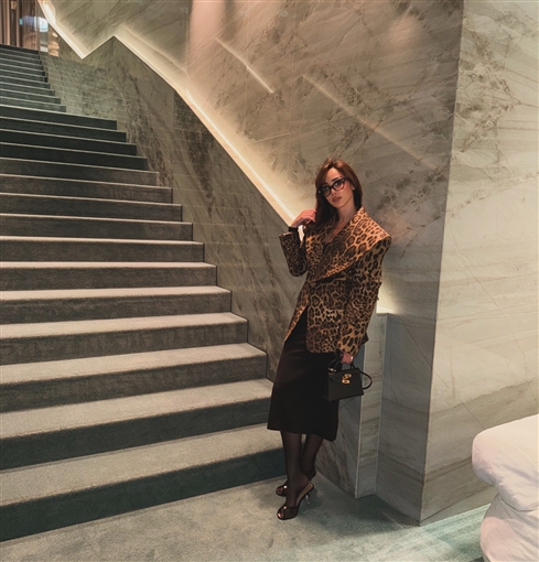 أطلت بسمة بوسيل في الصور بإطلالات متنوعة منها جاكيت واسع بنقشة ليوبارد مع جيب أسود متوسط الطول.