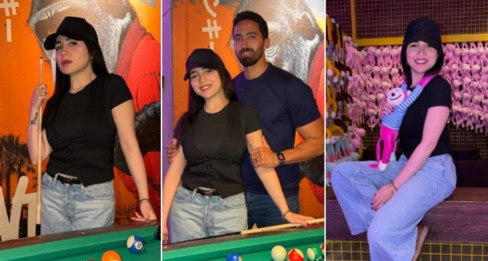شاركت الفنانة مي عز الدين جمهورها بصور جديدة لها من رحلة إلى الملاهي مع زوجها.