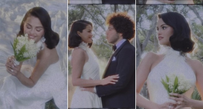 وظهرت سيلينا جوميز في جلسة التصوير بفستان زفاف بسيط ورقيق وأمسكت في يديها باقة ورود بيضاء، ولم تكن الصور واضحة تماما لكنها اكتفت بمشاركة جمهورها بجزء من لحظاتها السعيدة.