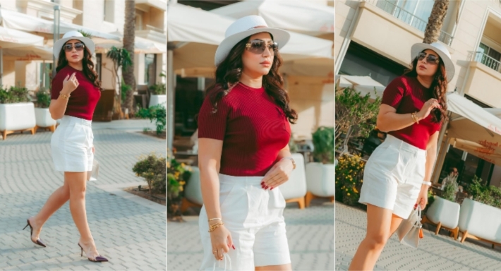 أطلت بوسي في الصور بإطلالة صيفية تميزت بتوب أحمر وشورت أبيض مع قبعة بيضاء، وحصدت إطلالتها إعجاب متابعيها.