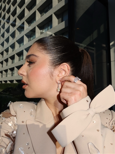 ولملمت مايان السيد شعرها من الأمام ورفعته للأعلى على شكل ذيل حصان، وتزينت بقرط وخاتم من renee jewellers