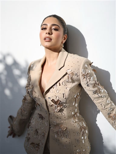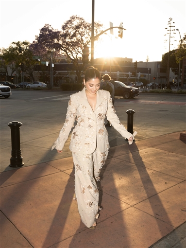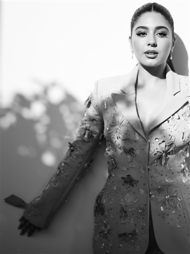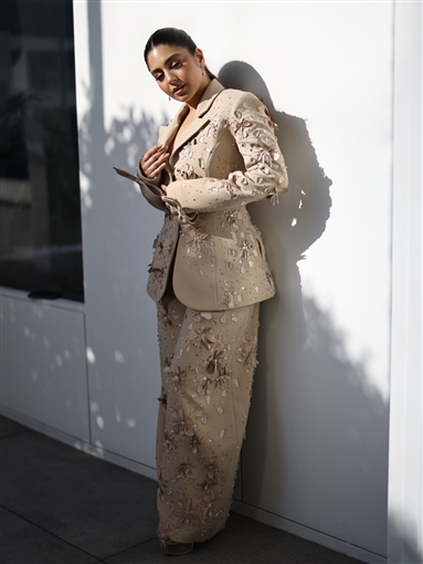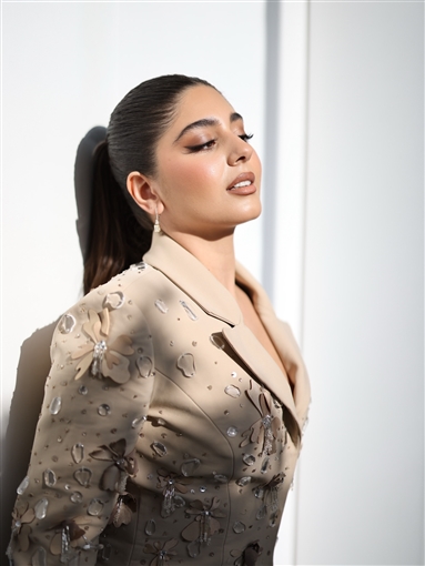 ارتدت مايان السيد بدلة واسعة، مزينة بتطريزات ورود من نفس اللون، مع شكل فيونكة في نهاية الأكمام