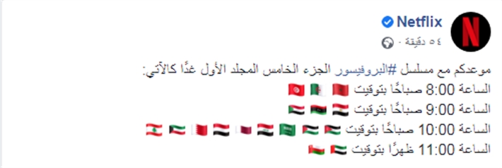 كشفت منصة "نتفليكس" عبر حسابها بموقع التواصل الإجتماعي Facebook، عن توقيت طرح الجزء الخامس من مسلسل "la casa de papel" في مختلف البلدان العربية.