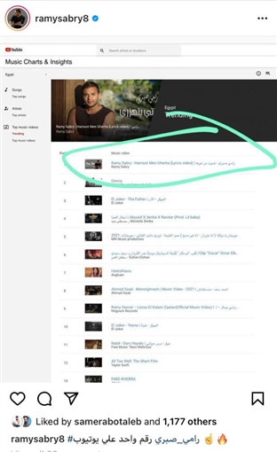 ونشر رامي صبري عبر حسابه على Instagram صورة توضح تصدر أغنيته ليوتيوب وعلق عليها: "رامي صبري رقم واحد على اليوتيوب".