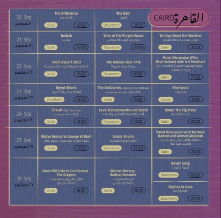 يضم البرنامج 15 فيلما روائيا شارك في مهرجانات سينمائية عالمية وحصل على اهتمام واسع من الجمهور والنقاد. بالإضافة إلى ثلاثة برامج للأفلام القصيرة، سيستمتع الجمهور بأفلام مثل: العاديون، راينجولد، الكل يتحدث عن الطقس، شرف، تحت الشجرة، توباب، حكايات البيت الأرجواني، ربيعة كورناز ضد جورج دبليو بوش، غرام أورفيا، أغنية الغراب، فرنر هرتسوج – حالم راديكالي، تعال معي إلى السينما - عائلة جريجور، الحب والمارك الألماني والموت،جولة ميم المملة، حكايات البيت الأرجواني، والسد. بعض هذه الأفلام تعرض للمرة الأولى بمصر.