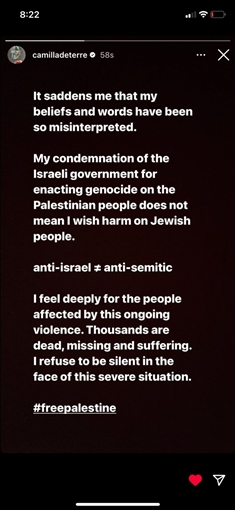نشرت كاميلا ديتيري صورة على انستجرام تشبه إسرائيل بالتيار النازي، مشيرة إلى أن كلاهما تسببا في طرد الملايين من بيوتهم، ووضع الضحايا في معسكرات وإقامة عقاب جماعي، كما أضافت عبارة "تبا لإسرائيل وأمريكا وفلسطين حرة".